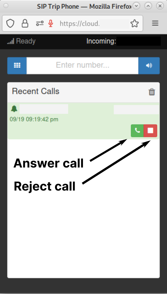 Of course you can answer incoming calls. When an incoming call is received, you should see the green button for answering the call and the red button for rejecting the call, as shown in the image attached below. You haven't mentioned if you connect SIP Trip Phone to your SIP provider via Asterisk or directly, what web server you use and what browser. If you have closely followed the installation guide for SIP Trip Phone on our website ( https://www.doublebastion.com/install-nextcloud/#install-sip-trip-phone ) and you can't see the two mentioned buttons when a call comes in, it can be a sign that SIP Trip Phone is not properly connected to Asterisk or to the SIP provider. Even more probable is that the system's microphone is captured by a different application (a softphone or a different web application). If this is the case, you won't see the two buttons and you won't be able to receive calls with SIP Trip Phone until you close the application(s) that are using the microphone. To check if this is the problem, you can follow these steps: 1. Remove all history and cache of Firefox (on your desktop/laptop) and close it. 2. Start Firefox, log in to Nextcloud and open SIP Trip Phone. 3. Use your physical mobile phone and not a softphone or a different browser phone to make a call to the phone number associated with SIP Trip Phone. You should see the incoming call and the 'Answer call' and 'Reject call' buttons. |