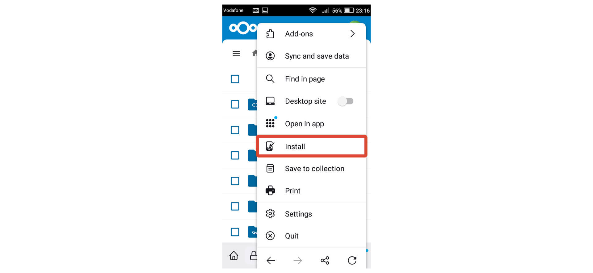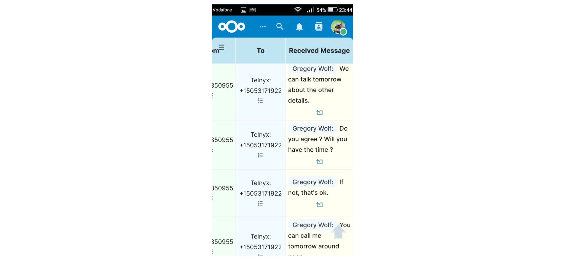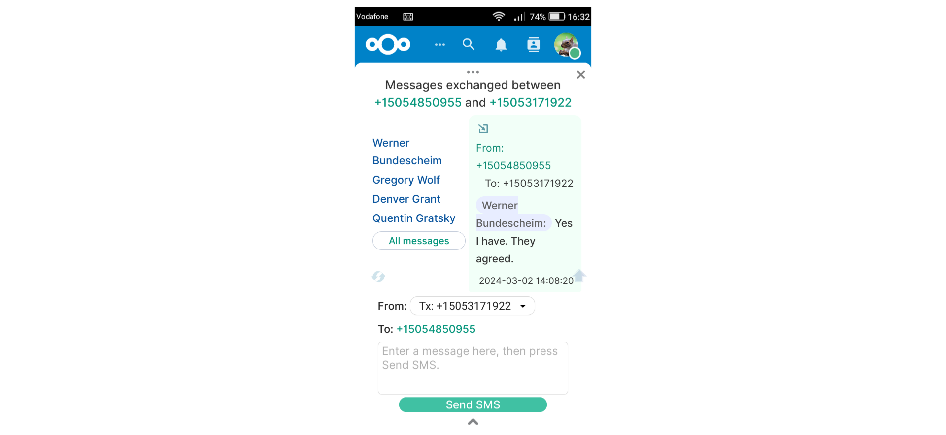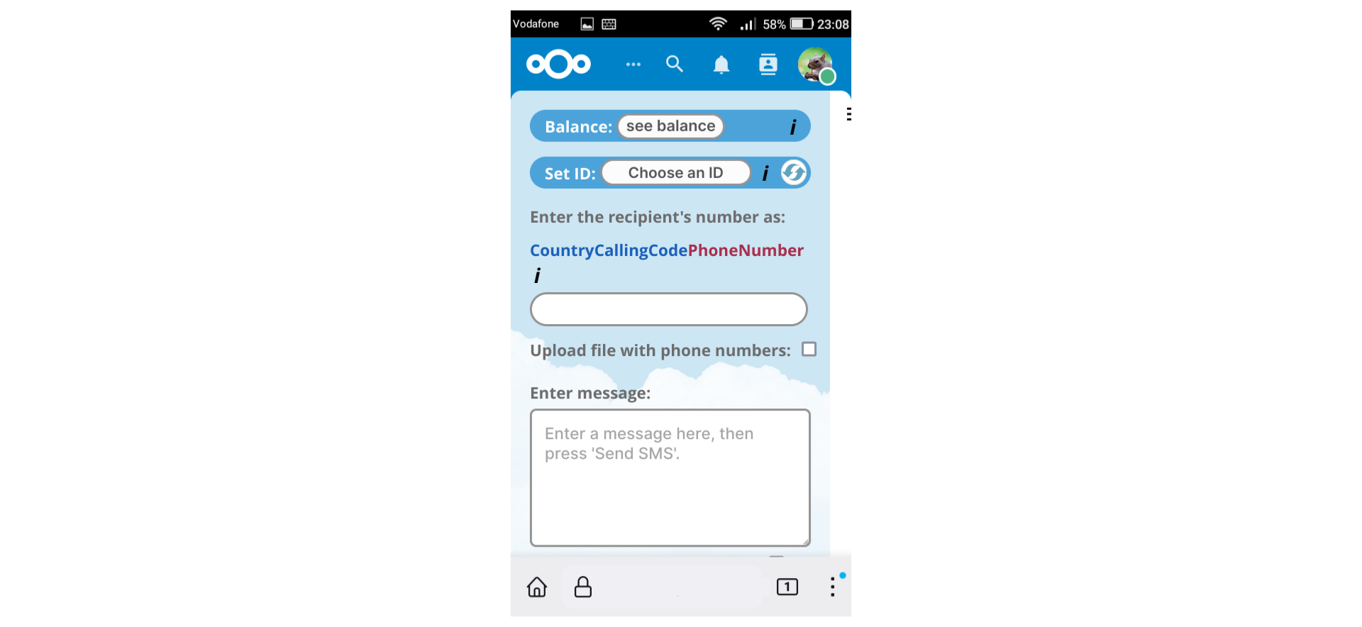 Hello, We published a new version of SMS Relentless which was optimized to work on mobile phones. It also introduces the 'Conversations' page ( image 1_ ). If you are still interested to use the app on mobile phones, the easiest way is to install Firefox for mobile (version 123.0 or newer), then verify that 'Ask to save' is set in Firefox's 'Settings' > 'Logins and passwords' > 'Save logins and passwords' ( image 2_ ). Then access your Nextcloud login page in Firefox and after you enter your username and password, when you are asked if you want Firefox to remember your login, answer Yes. After you've logged in to Nextcloud, open the main Firefox menu (from the low right-hand corner) and choose 'Install' ( image 3_ ), to create a shortcut for Nextcloud on your mobile's screen. This shortcut will look like any mobile app ( image 4_ ). In this way, each time you want to access Nextcloud and its applications, including SMS Relentless, you just press the 'Nextcloud' shortcut, choose the proposed login credentials which are stored safely by Firefox (to avoid writing again your username and password) and then you are in Nextcloud, which has a responsive design. At least its main functions and SMS Relentless can be used on mobile phones. We are not referring here to using the official Nextcloud app for Android or iPhone. That is an entirely different setup and it doesn't allow using the apps installed inside Nextcloud, like SMS Relentless. So, once you are logged in to Nextcloud using Firefox for mobile, you can access SMS Relentless like on a desktop computer, and use all its functions, including listing all the received messages ( image 6_ ) or using the reply pop-up window ( image_7 ) to send a quick reply. |