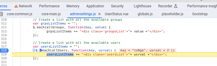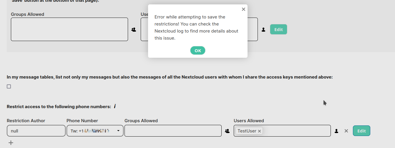 The lists of available users and groups are working fine on our server, without any errors. The code that you show in the screenshot from above has nothing exotic in it. It just collects the users from the 'allUsers' variable and adds some html tags around them to create the drop-down list. The problem is that in your setup, the 'allUsers' variable comes with some weird content in it. Since, as you mention, in the restricted numbers section, the groups are shown correctly, and the JavaScript code for groups is identical with that for users, as can be seen above, it follows that the code for users is fine, but the content that comes from the database and is stored in the 'allUsers' variable, is not fine. This can have multiple causes, including using an incomplete or outdated PHP or MariaDB installation. 1. Have you created multiple users, both admins and non-admins, in your Nextcloud ? Do their names contain characters such as dots, dollar signs, etc. ? Have you created multiple groups apart from the 'admin' group in your Nextcloud and assigned users to groups ? Do the group names contain special characters ? 2. What errors do you see in the Nextcloud log (Administration Settings > under Administration > click Logging) ? The error that you posted is generated by some Nextcloud file and is out of place, since it mentions "String.prototype.toRgb is deprecated! It will be removed in Nextcloud 22.", but it shows up in Nextcloud 28. When you click on the users/groups buttons to see the list with all users/groups, do you see any errors in your browser's console (not in the pop-ups) ? 3. Since you mention that you installed Nextcloud manually, from the zip archive downloaded from the Nextcloud website, we deduce that you are using Apache, instead of Nginx. Please confirm that you installed Nextcloud on a subdomain and not on a subdirectory and that you configured Apache as explained here: https://www.doublebastion.com/apache-configuration-for-nextcloud/ , especially the part about enabling pretty URLs and updating the '.htaccess' file. 4. Please confirm that you run the latest version of Nextcloud (28), the latest version of SMS Relentless (1.3.2), on an Ubuntu server with the latest version of PHP and MariaDB. 5. Please provide the URL of the admin settings page of the app. Replace your real domain and subdomain with 'cloud.example.com' for privacy reasons, like this: https://cloud.example.com/settings/admin/sms_relentless |
