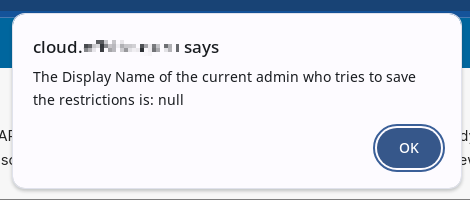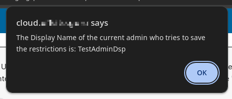If you can open the "/var/www/cloud.mydomain.foo/apps/sms_relentless/js/adminsettings.js" file and search for this line: $('[id^="rstsave-"]').click(function(event) { you can add right below it the following line: alert("The Display Name of the current admin who tries to save the restrictions is: "+ crntadmDispName); to see if your Display Name as an admin is correctly retrieved from the database. Then click on the Save button on the row of the restriction, to see what the alert shows. |